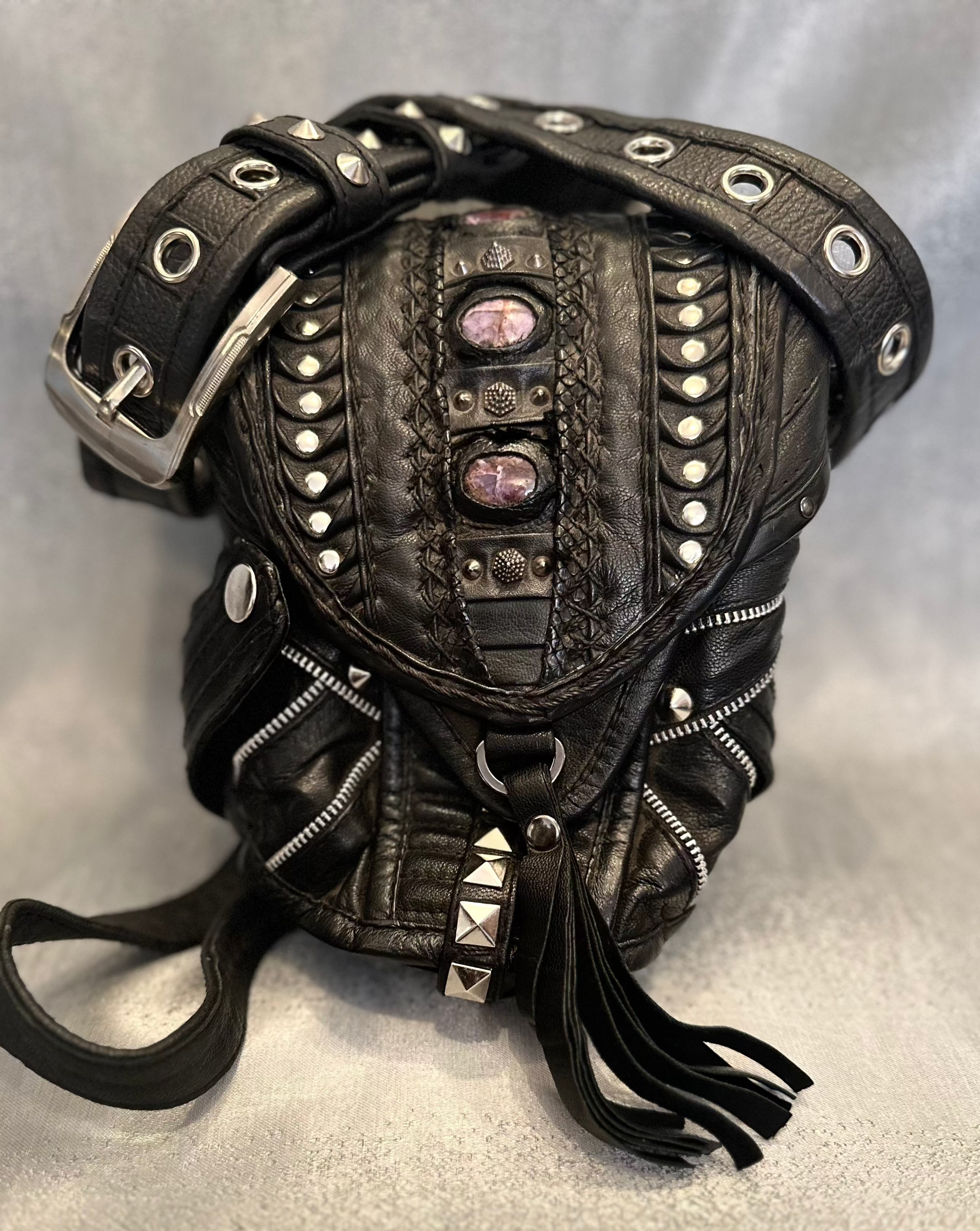 This accessory features three stunning amethyst crystals, adding a touch of daring sophistication. The intricate silver hardware and leather work create a sense of challenge and adventure.