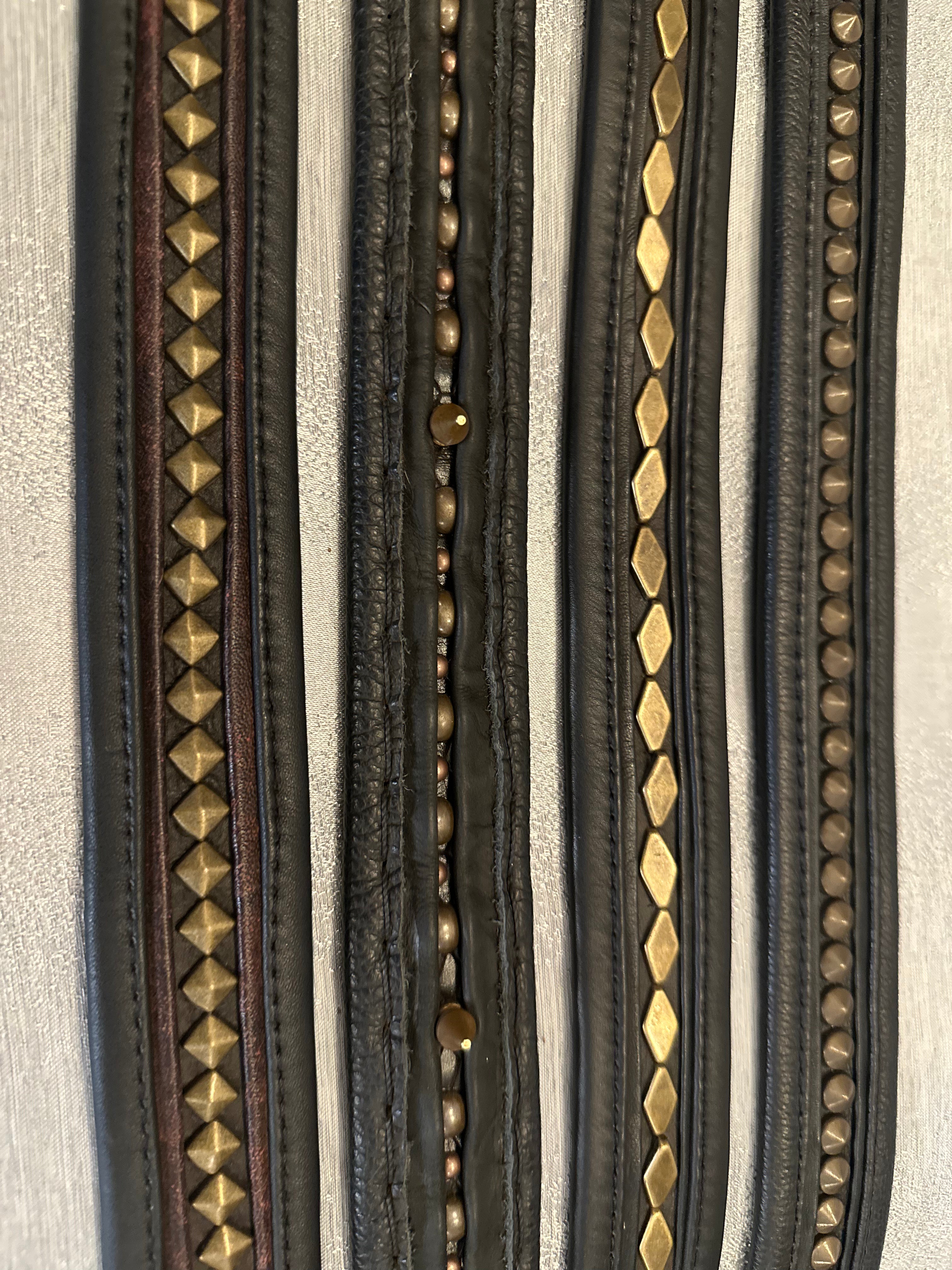 4 Belts triangle and circle studs, black leather, gold hardware