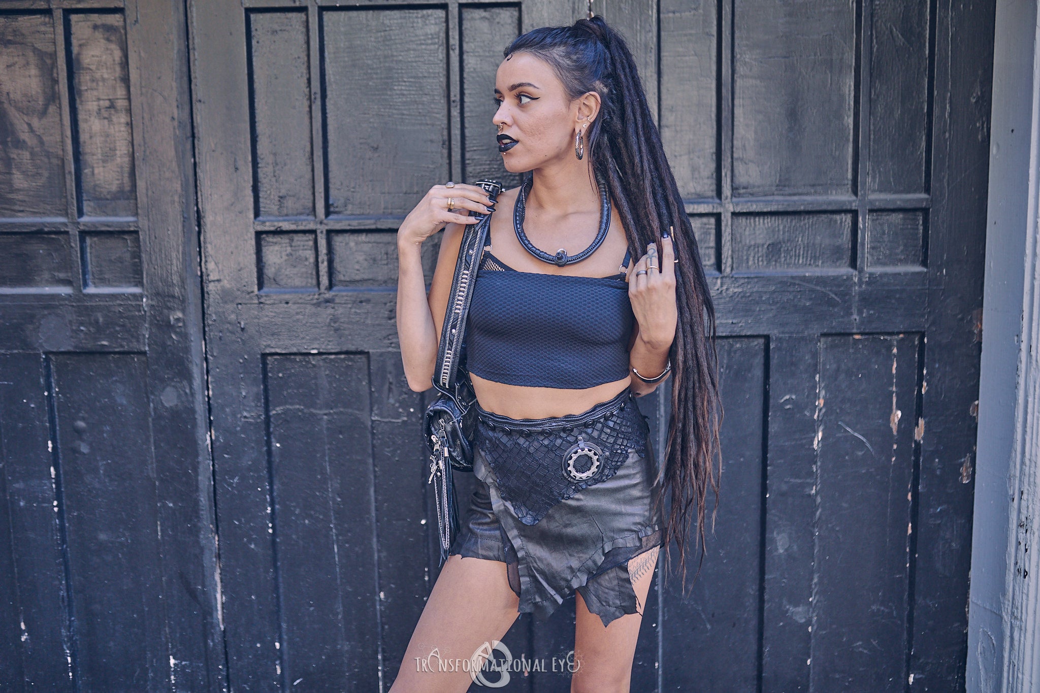 All eyes on this pirate, steam punk, one of a kind, recycled tire leather combination skirt! Soft and sexy, a skirt that flows with the music -