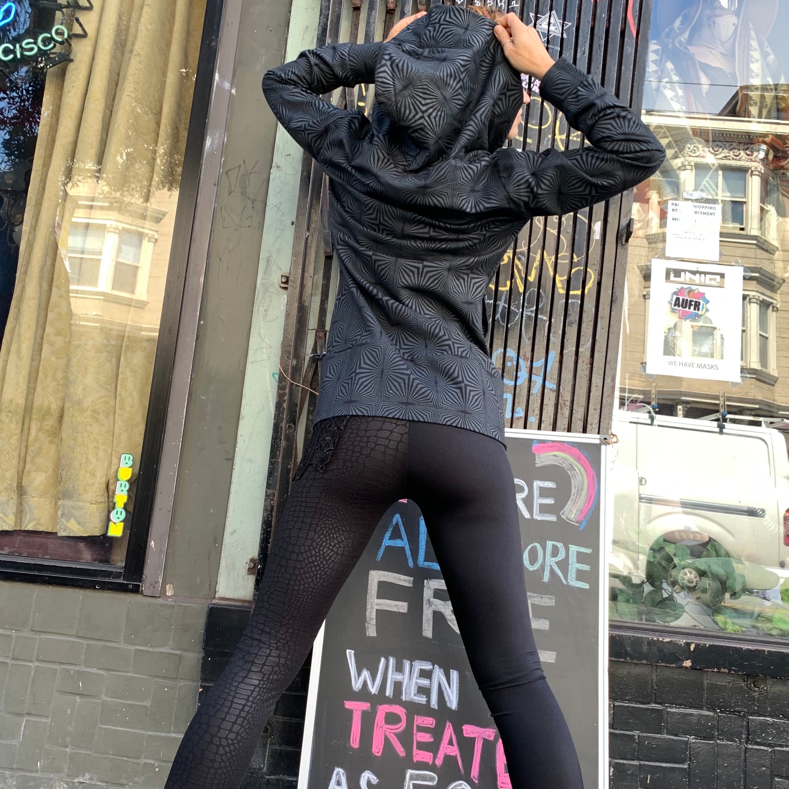 This light and versatile Black/Grey jacket is perfect for Spring or Fall season. With a large hood, and fun optical illusion design, you won't be able to take it off!